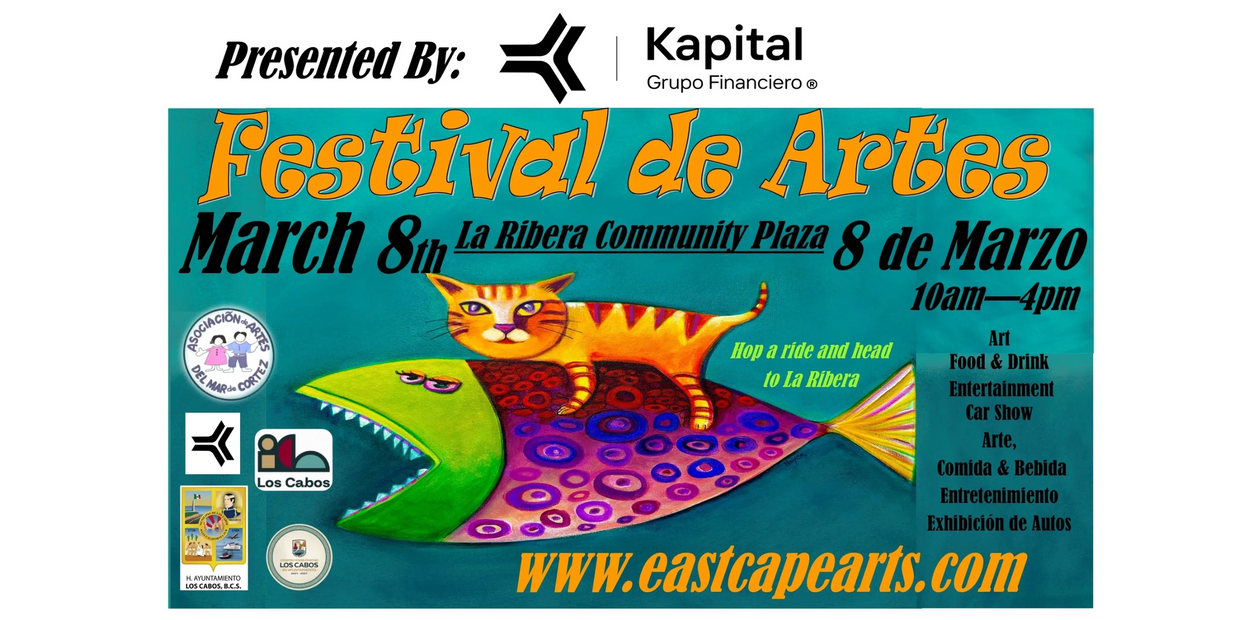 We are ready for a really HUGE festival again in La Ribera, marking the 31 years of Festival de Artes! 31 years is a really long time for a continuously ran event and we are up to the task of making it a really special event! Our new location (map below) offers grounds better for mobility challenged guests, and new opportunities with new attractions! Our classic car show will expand for 2026 at our larger beautiful festival site! We are pleased to announce Kapital Grupo Financiero as our title sponsor! One fun note is we have adopted the cat on fish logo by Mary Naylor as the signature Festival de Artes logo for our marketing purposes! When you see it, you know it means Festival de Artes! We will have a different artists design for our t-shirts each year, so don't worry about your FdA shirt collection continuing to grow!