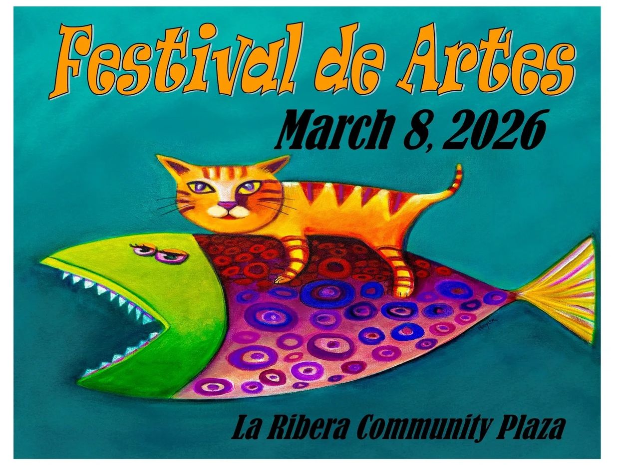 We are ready for a really HUGE festival again in La Ribera, marking the 31 years of Festival de Artes! 31 years is a really long time for a continuously ran event and we are up to the task of making it a really special event! Our new location (map below) offers grounds better for mobility challenged guests, and new opportunities with new attractions! It worked great in 2025, and we anticipate only better and more activities for your enjoyment. Our classic car show will expand for 2026 at our larger beautiful festival site! One fun note is we have adopted the cat on fish logo by Mary Naylor as the signature Festival de Artes logo for our marketing purposes! When you see it, you know it means Festival de Artes! We will have a different artists design for our t-shirts each year, so don't worry about your FdA shirt collection continuing to grow!